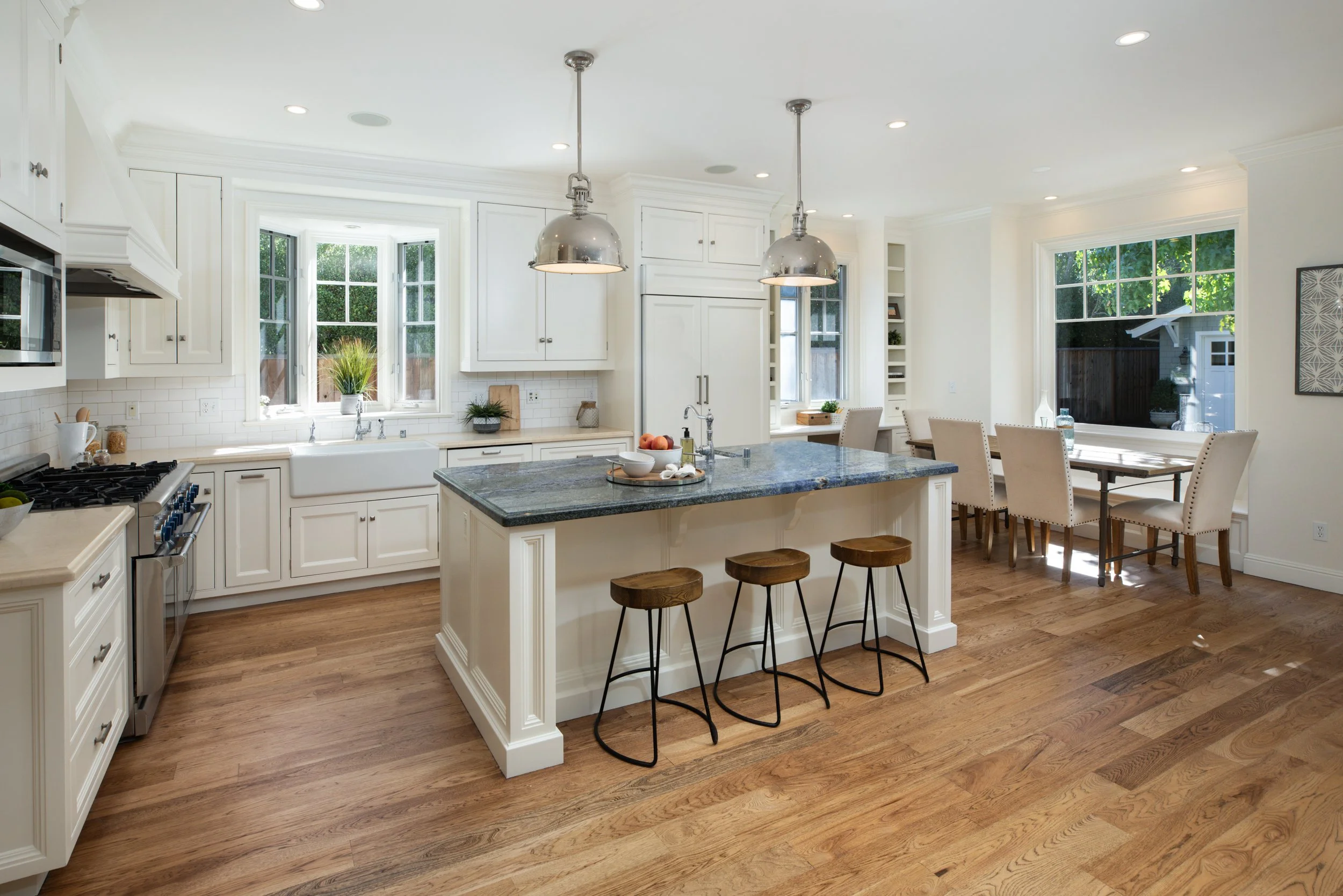 Stunning kitchen has soft white cabinetry topped in limestone slab with subway-set white tile backsplashes; an island with counter seating is topped in contrasting blue granite; large casual dining area with built-in desk and French door to the covered terrace