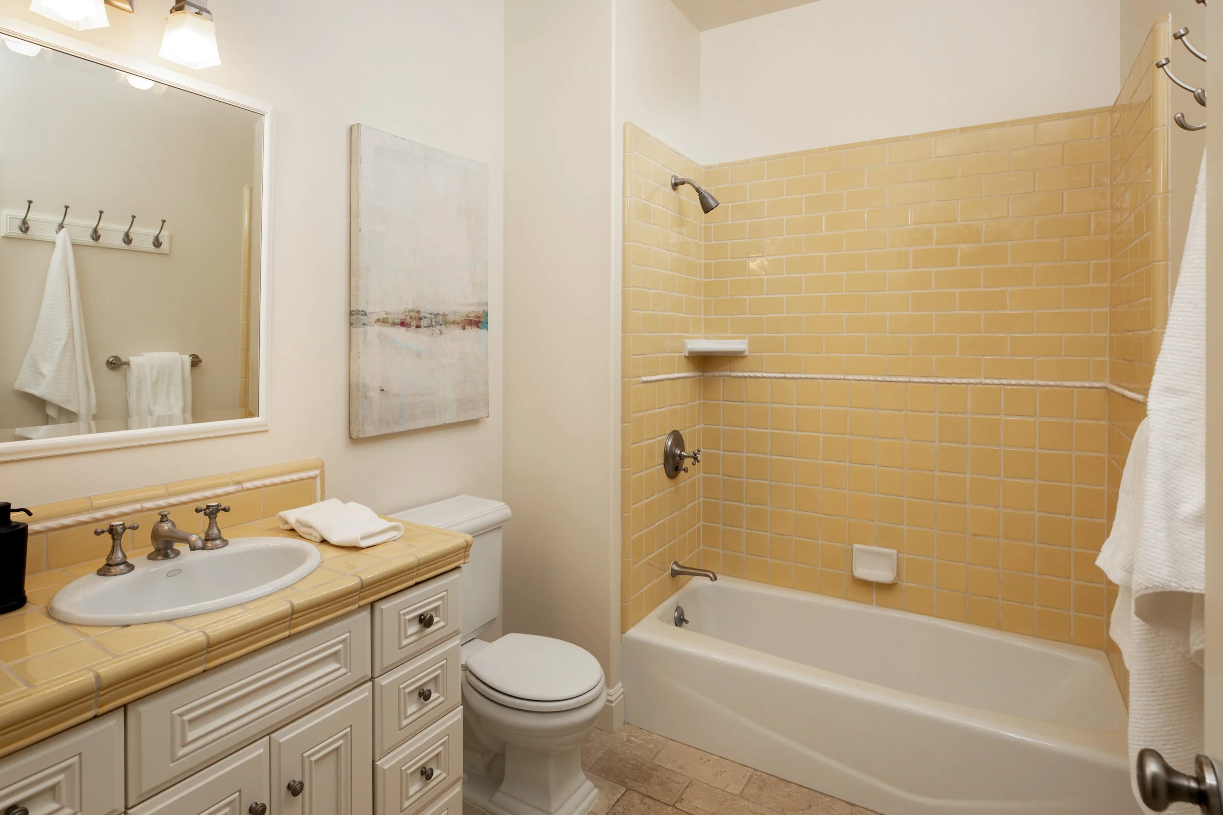 Upstairs bedroom with en suite bath with a tub and overhead shower, plus two additional bedrooms and a hallway bath featuring a dual-sink vanity and a separate room with a frameless-glass shower