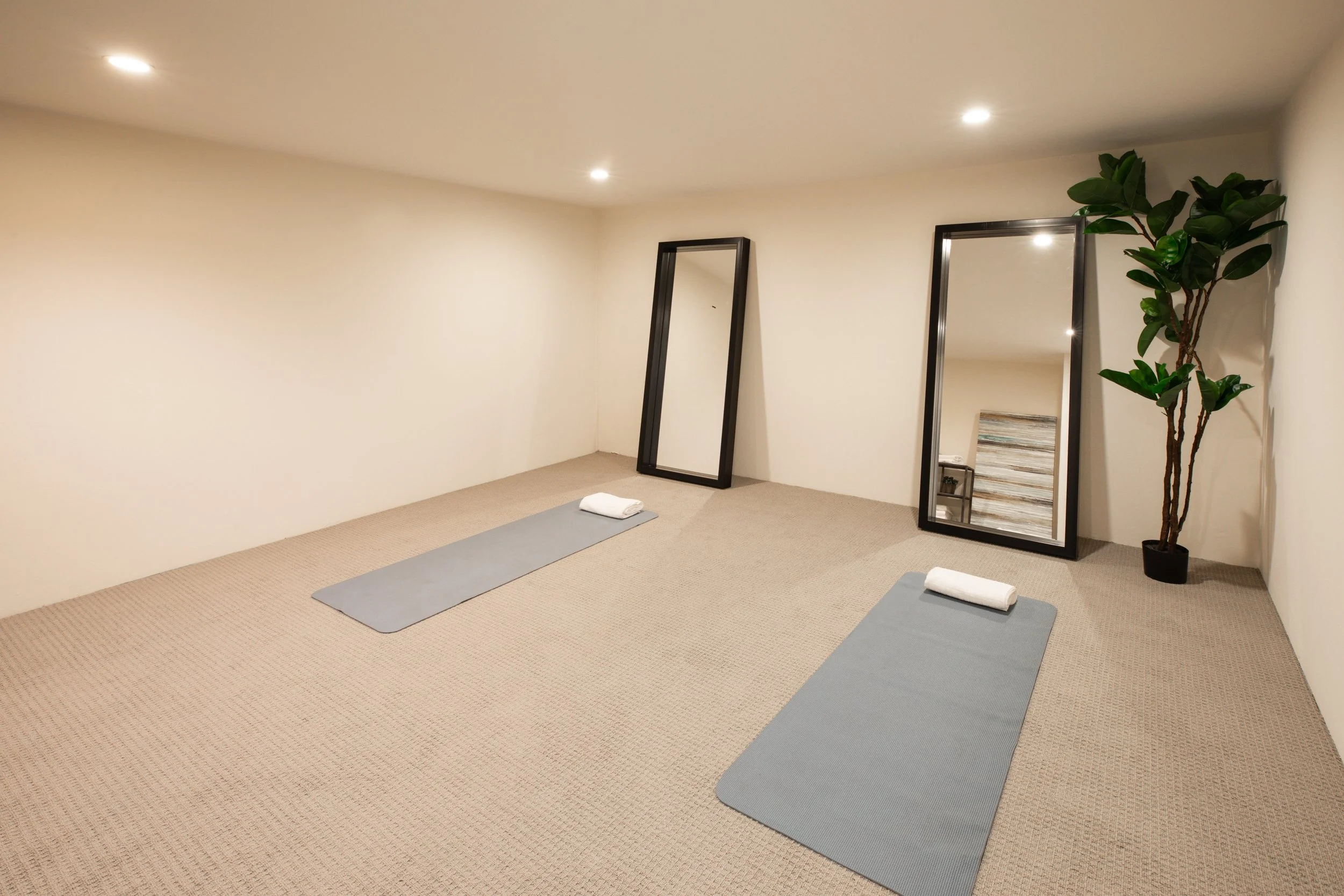 Two lower-level bedrooms plus gym and tiled bath with tub and overhead shower
